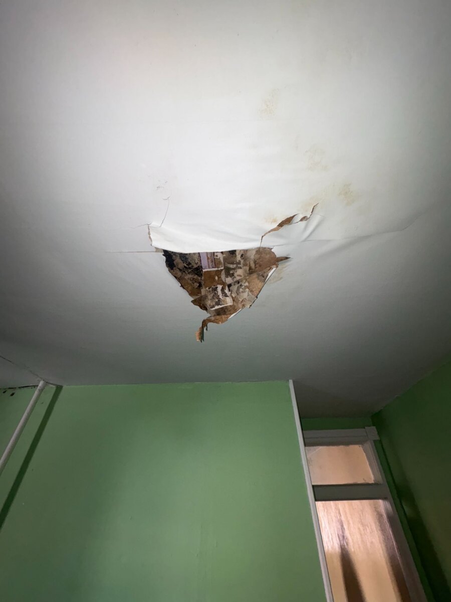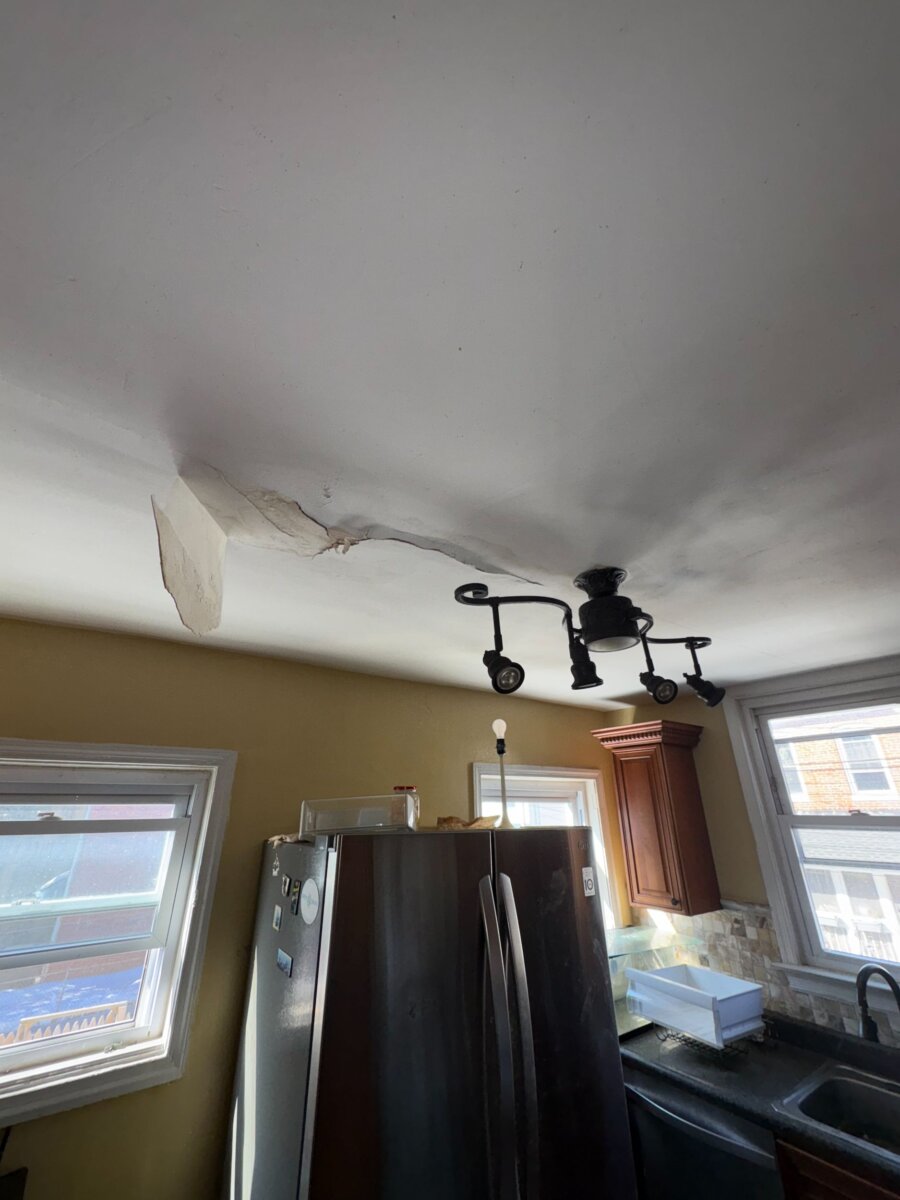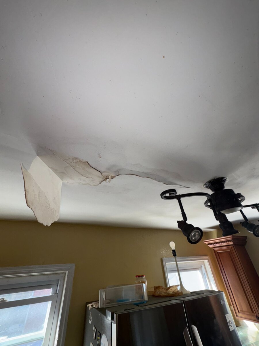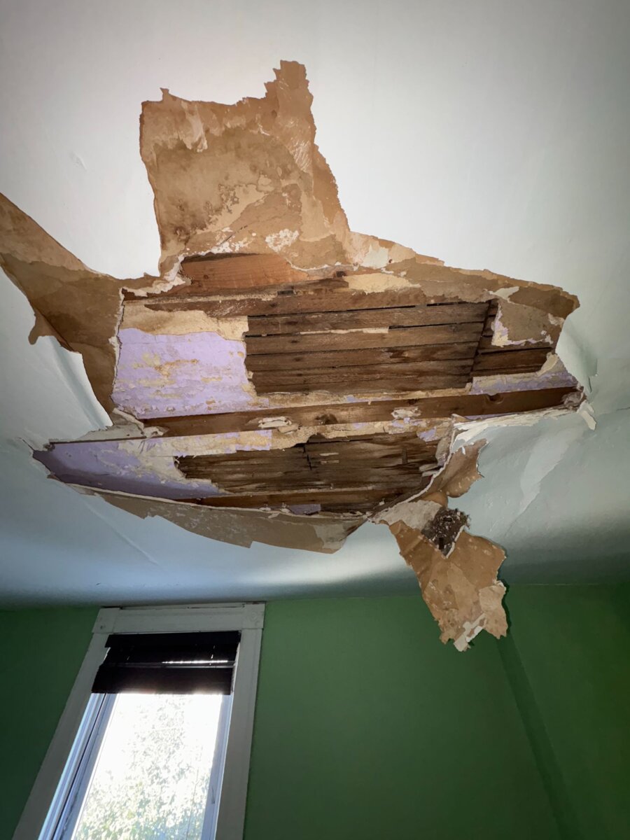 - Roof repair/replacement needed (visible sagging from prior leak)