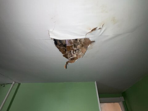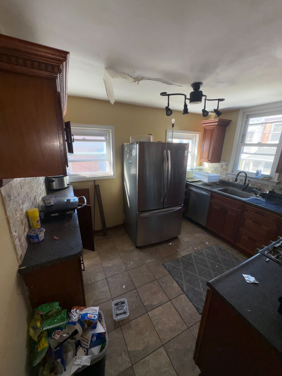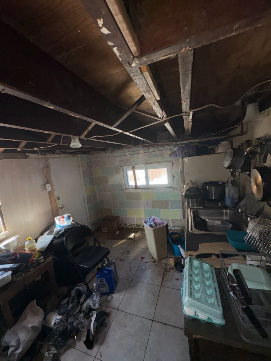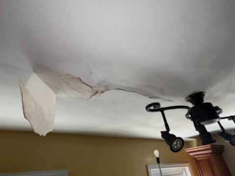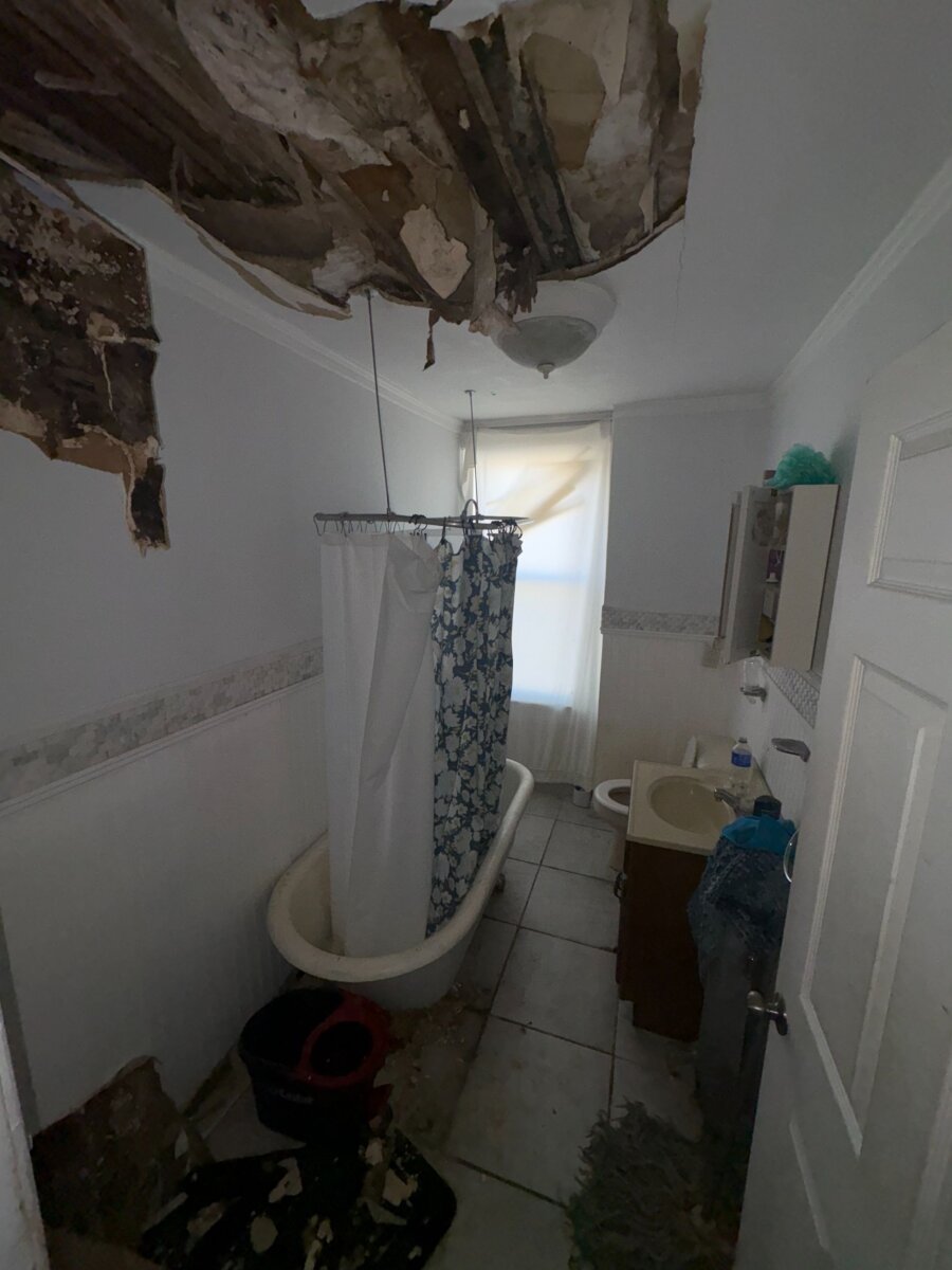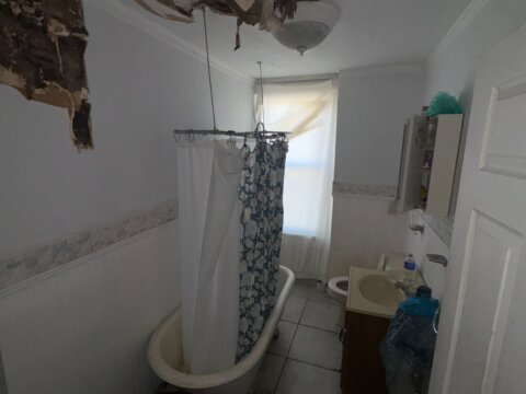 - Roof repair/replacement needed (visible sagging from prior leak)